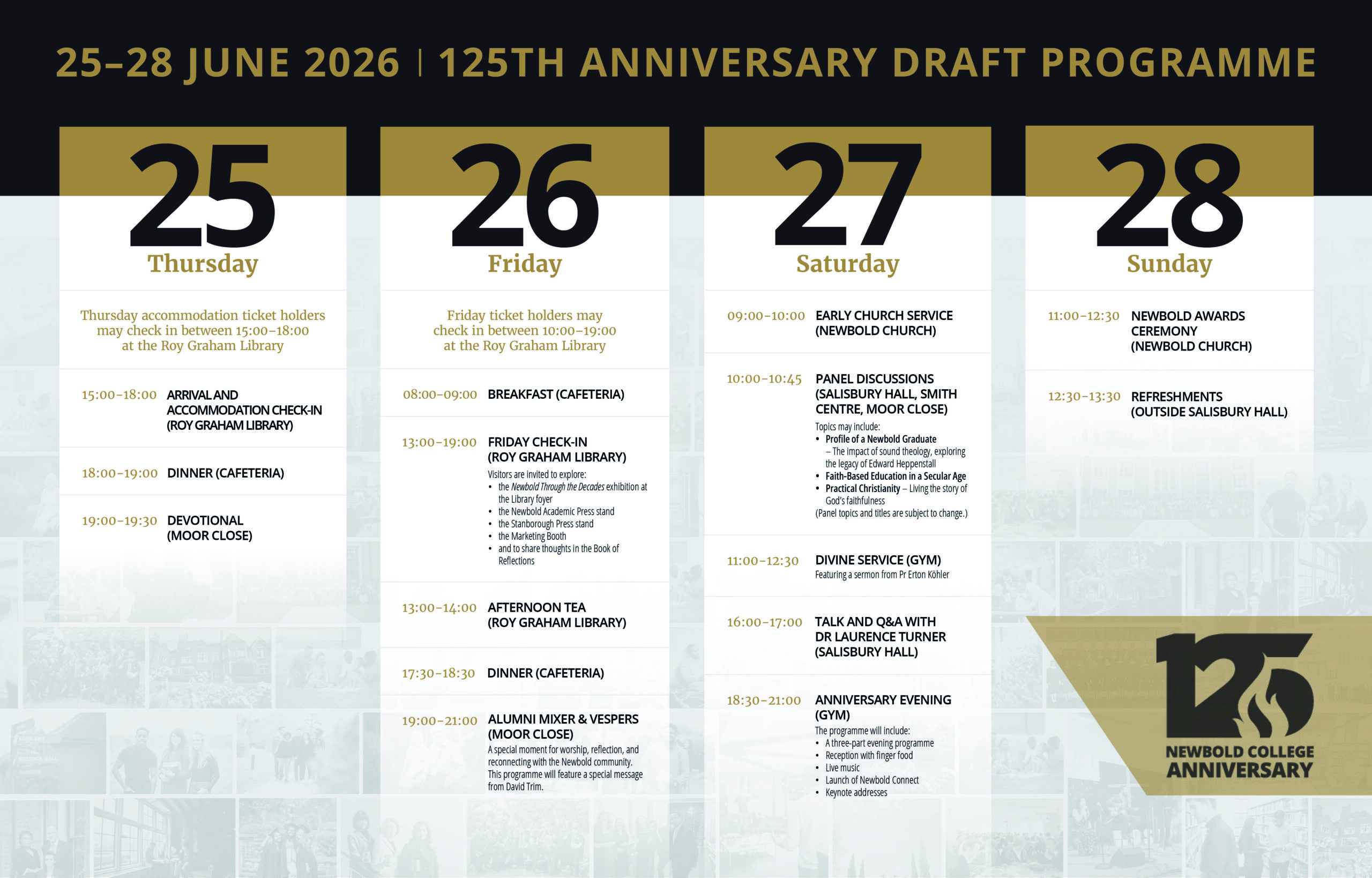 - Celebrate 125 years of Newbold College with an uplifting evening of music, a keynote address by GC President Elder Erton C. Köhler, and a visionary moment for the College’s future. Food is provided.